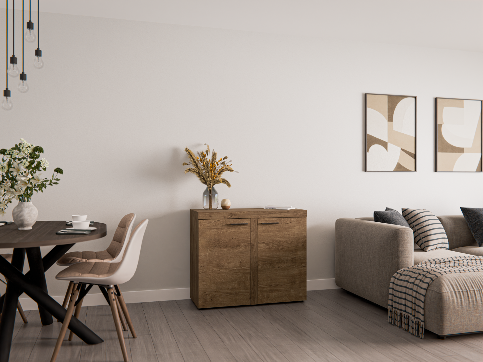 Komoda Rizo je nejen skvělým doplňkem k bytové stěně Rizo. Stejně výborně poslouží jako samostatný kus nábytku. Komoda má univerzální využití a nabízí dostatek úložného prostoru. Komoda je vyrobena z odolného a stálobarevného lamina. Komoda je dodávaná v demontu. Součástí balení je schematický montážní návod, včetně všech potřebných spojovacích prvků. Vyobrazené doplňky a dekorace nejsou v ceně.