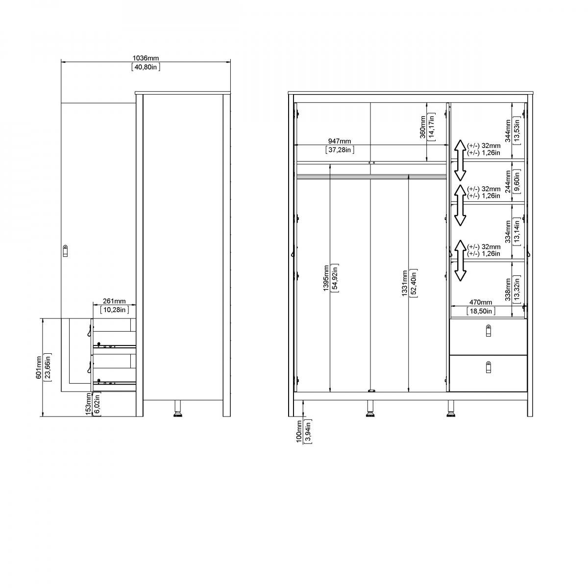 šířka 150 cm, se zrcadlem, šatní tyč, 3 nastavitelné police, 2 zásuvky, 2 druhy úchytek v ceně