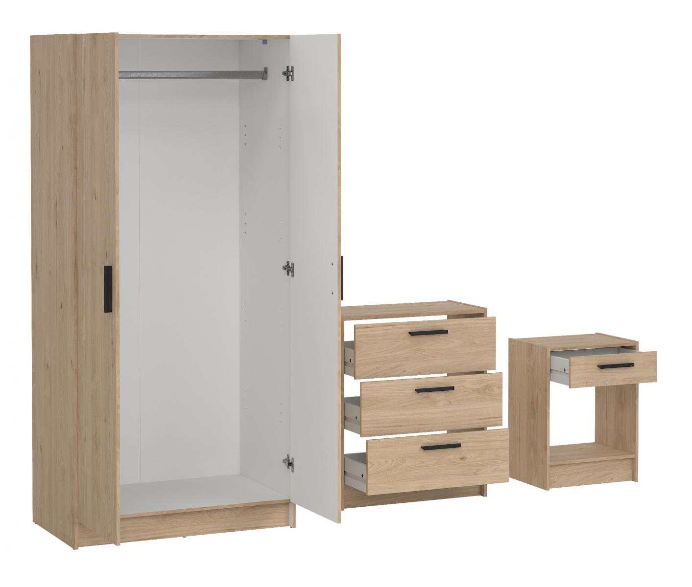 dvoudveřová šatní skříň + komoda se 3 zásuvkami + noční stolek