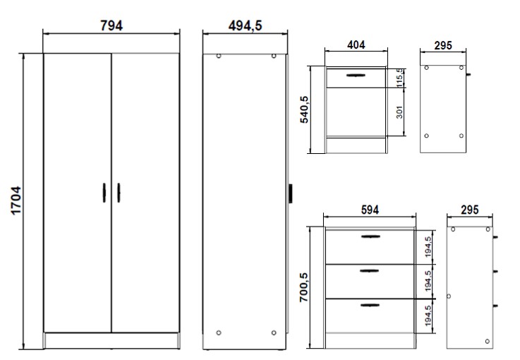 | Výška: | skříň 170,4 cm/ komoda 70 cm/ stolek 64 cm | Šířka: | skříň 79,4 cm/ komoda 59,4 cm/ stolek 40,4 cm |
