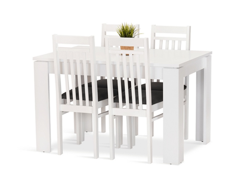 Jídelní sestava Dante 4 se skládá ze stolu a čtyř židlí. Tato jídelní sestava splní svůj účel na výbornou nejen v kuchyni, ale i v jídelně, nebo obývacím pokoji s jídelním koutem. Svou vysokou kvalitou a precizním zpracováním, uspokojí všechny budoucí, i ty velmi náročné, uživatele. Stůl je vyrobený z bílého matného lamina tl.22 mm, kostry židlí z bukového dřeva, barveného na bílou barvu. Jídelní sestava je dodávaná v demontu. Součástí balení je schématický montážní návod, včetně všech potřebných spojovacích prvků. Cena je uvedena za jídelní stůl a 4 židle. Úvodní fotografie je ilustrační. Židle budou dodané v modré barvě.