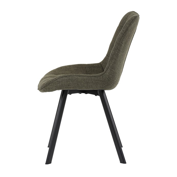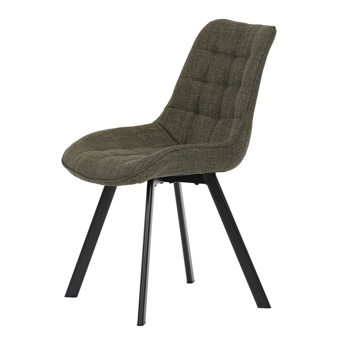 Židle je vyrobena s důrazem na detail. Je čalouněna kvalitní zelenou látkou, která je měkká na dotek a odolná proti opotřebení. Ergonomický tvar a polstrování zajišťují komfort i při delším sezení. Židle má 4 kovové nohy s černým povrchem, které poskytují stabilitu a trvanlivost. Nohy jsou mírně skloněné pro lepší rovnováhu a moderní vzhled.
