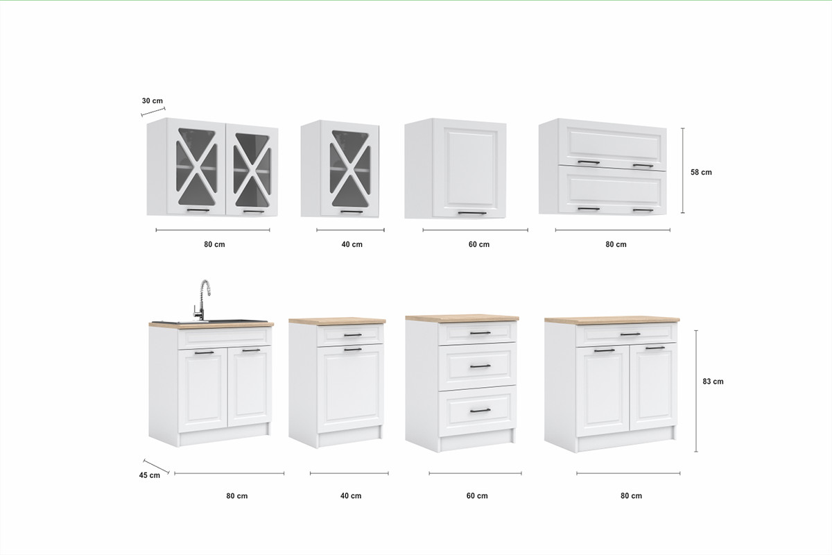 Kuchyňská linka Tyra je vyrobená ve velmi oblíbeném skandinávském stylu, který se hodí do kuchyně v paneláku i v rodinném domě. Tento styl má jedinečnou schopnost proměnit Vaši kuchyň v útulnou a zároveň funkční místnost, kde bude radost vařit i péct. Kuchyňská linka Tyra nabízí dostatek úložného i pracovního prostoru. Všechny skříňky jsou samostatné, takže si je můžete sestavit tak, jak Vám to vyhovuje. Korpusy skříněk jsou vyrobené z lamina 18 mm s hranami ABS a dvířka jsou MDF 16mm. Všechny skříňky jsou dodávány v demontu. Součástí balení je montážní plánek včetně všech potřebných spojovacích materiálů. Cena je uvedena za sestavu vyobrazenou na úvodní fotografii BEZ PRACOVNÍ DESKY, s úchytkami, které jsou vyobrazeny v doplňkových fotografiích. Pracovní desku lze dokoupit nad každou skříňku zvlášť podle její šíře. Vyobrazené spotřebiče, dřez, baterie, doplňky a dekorace nejsou v ceně.