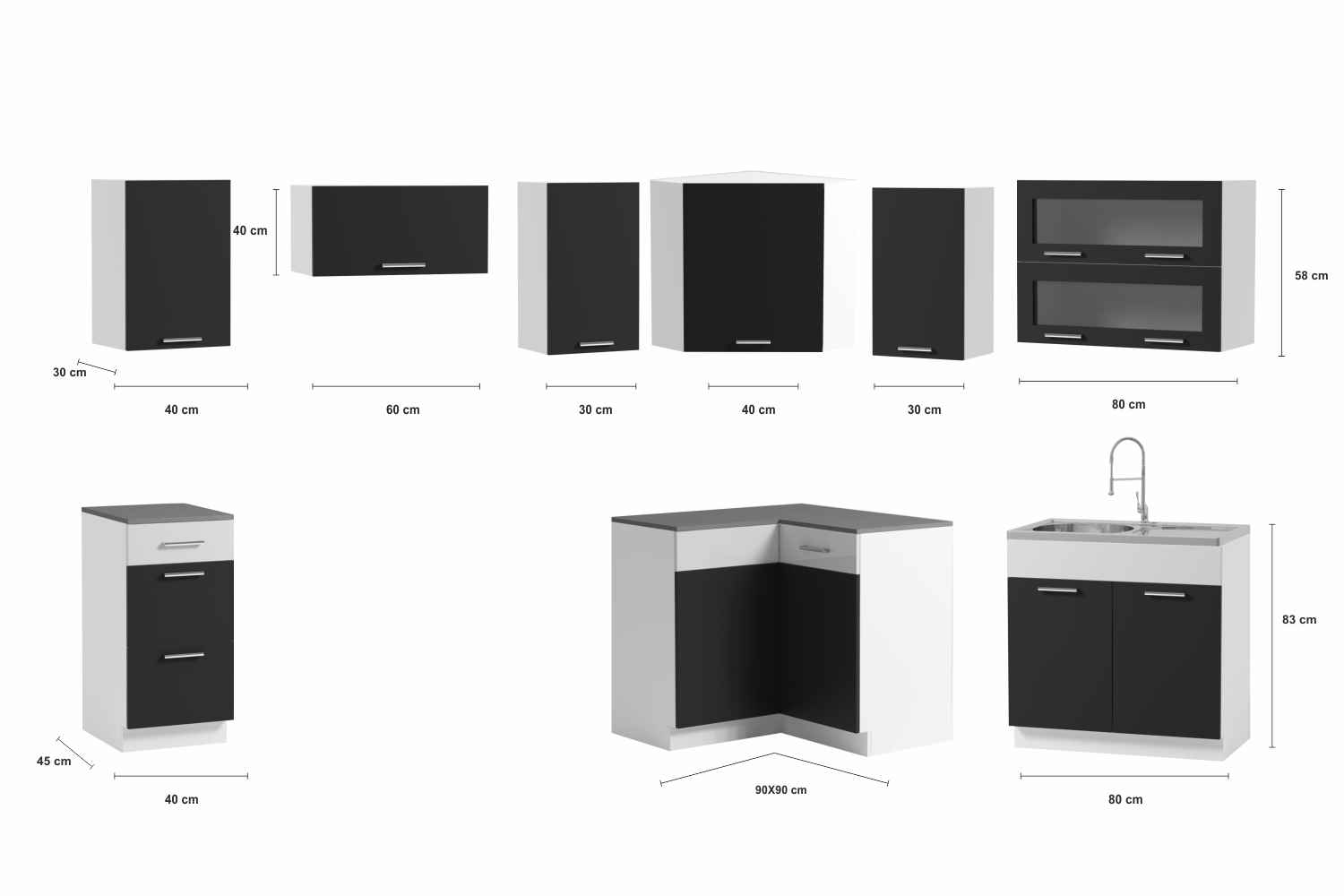rohová skříňka 80x80 cm, v.83 cm Skutečný rozměr skříňky bez pracovní desky je 80x80 cm/ výška 83 cm, s pracovní deskou je rozměr 90x90 cm. V případě zájmu o dokoupení desky nad tuto skříňku, je potřeba objednat dělenou desku 90 a 30 cm