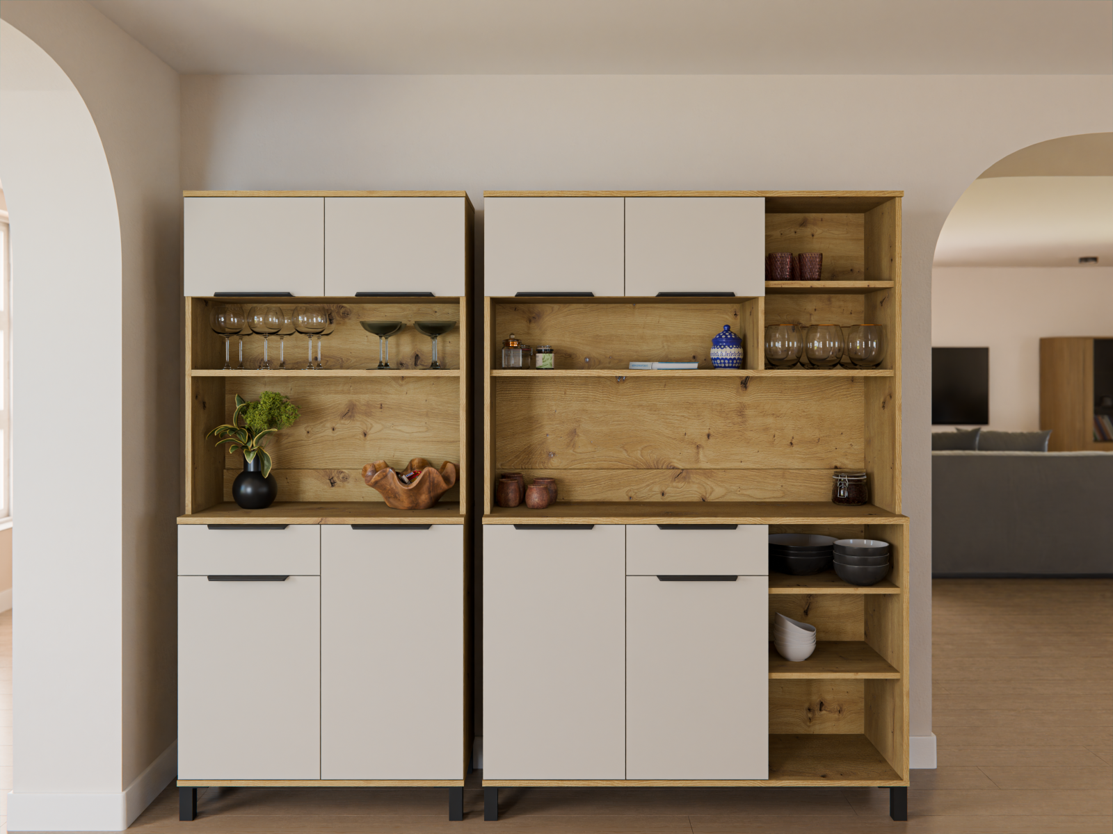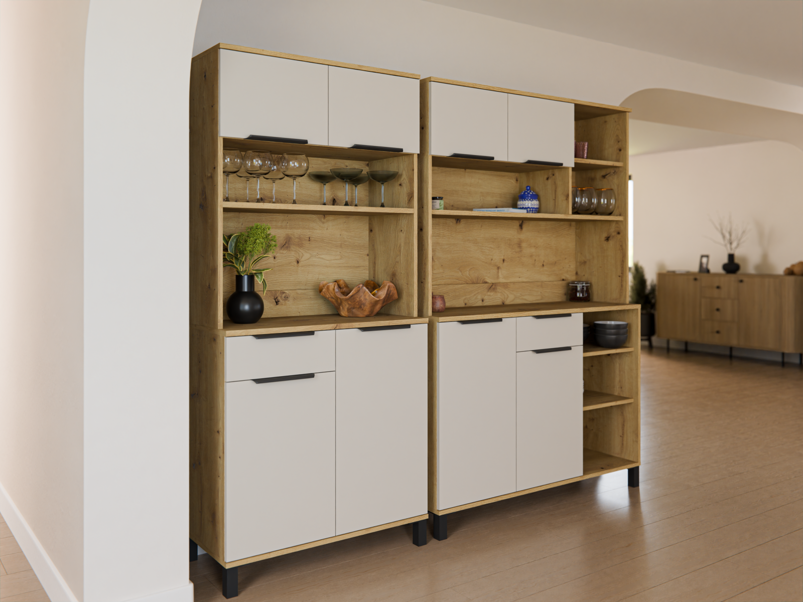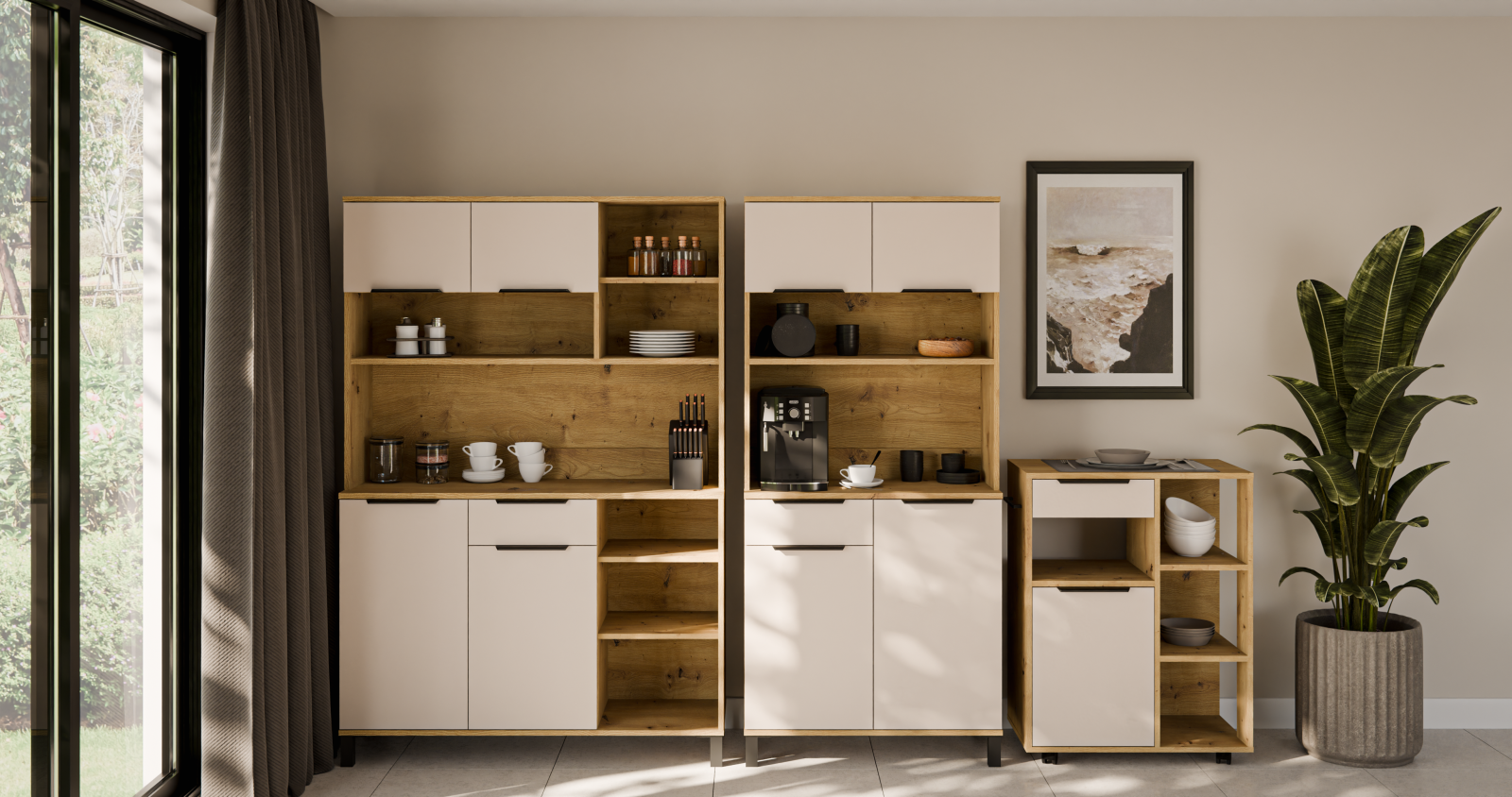Nadčasová kolekce Selva Bufet navazuje na linii kuchyňských skříněk Selva. Dvířka v dekoru kašmír v kombinaci s přírodními detaily přinášejí do interiéru lehkost a svěžest. Jednotný design a precizně zpracované detaily podtrhují moderní charakter celé kolekce a dodávají prostoru osobitý styl. Z bohaté nabídky prvků si můžete sestavit kuchyň přesně podle vašich představ a prostorových možností.