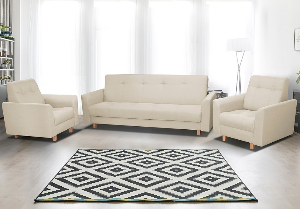 Sedací souprava Gala potěší milovníky retro designu. Pohovka je rozkládací a samozřejmostí je i praktický úložný prostor. Retro styl podtrhují dřevěné nožky a prošití s vtahy. Je potažena příjemnou kvalitní látkou v šedobéžovém odstínu (barvu nejlépe vystihuje poslední menší obrázek). Výplň sedáku tvoří kombinace pružin bonell s kvalitní PUR pěnou. Jednoduchým rozložením pomocí systému klik-klak vznikne lůžko k občasnému přespání. Vyobrazené dekorace nejsou v ceně.