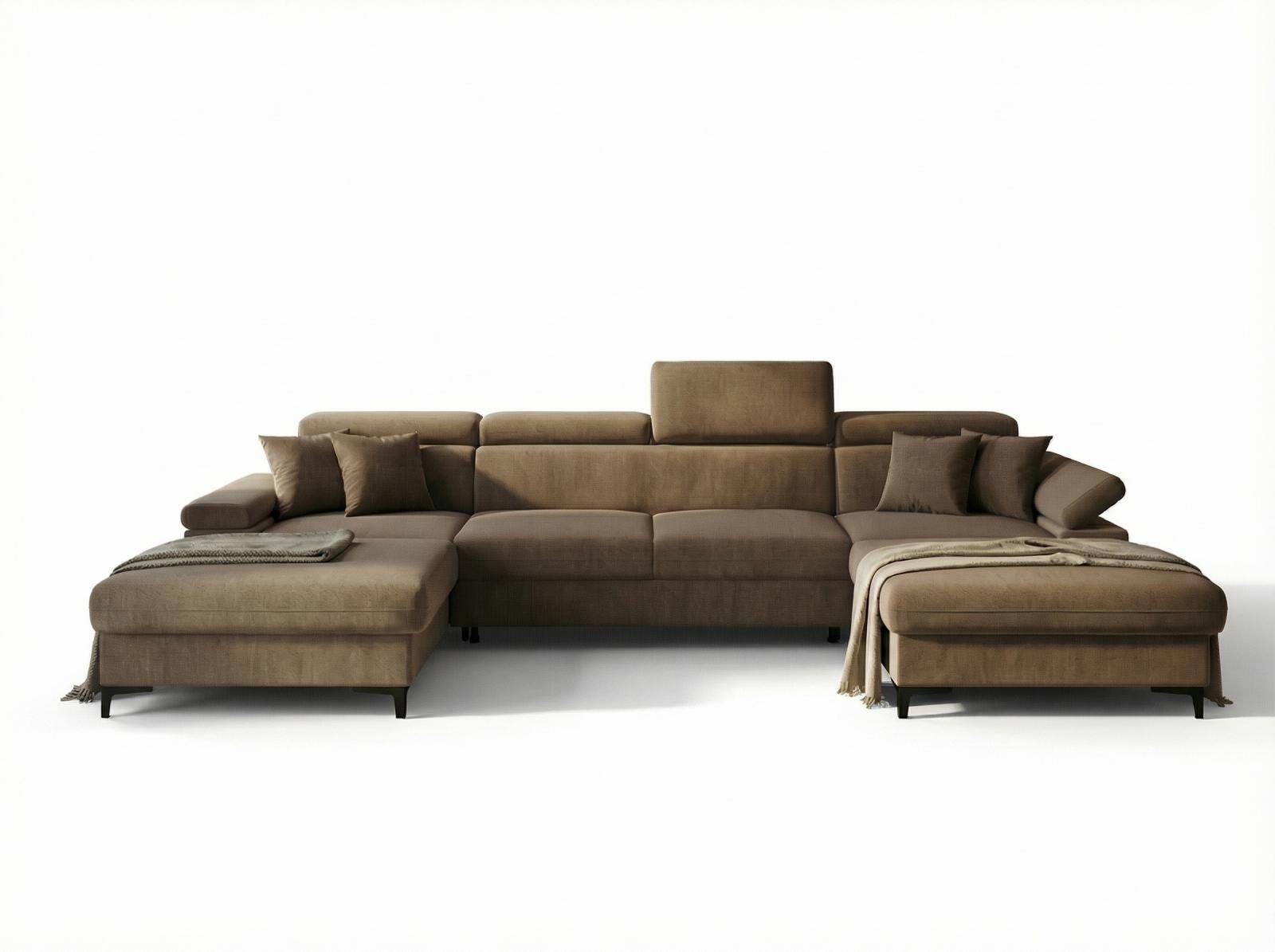Souprava je potažena kvalitní čalounickou látkou Monolith, která je příjemná na dotek, odolná, voděodpudivá a pokrytá speciální hydrofobní vrstvou. Díky rozkládací funkci ji snadno proměníte na lůžko vhodné pro občasné přespání. Praktický úložný prostor se nachází pod oběma otomany.Polohovatelné opěrky hlavy zvyšují komfort při relaxaci.