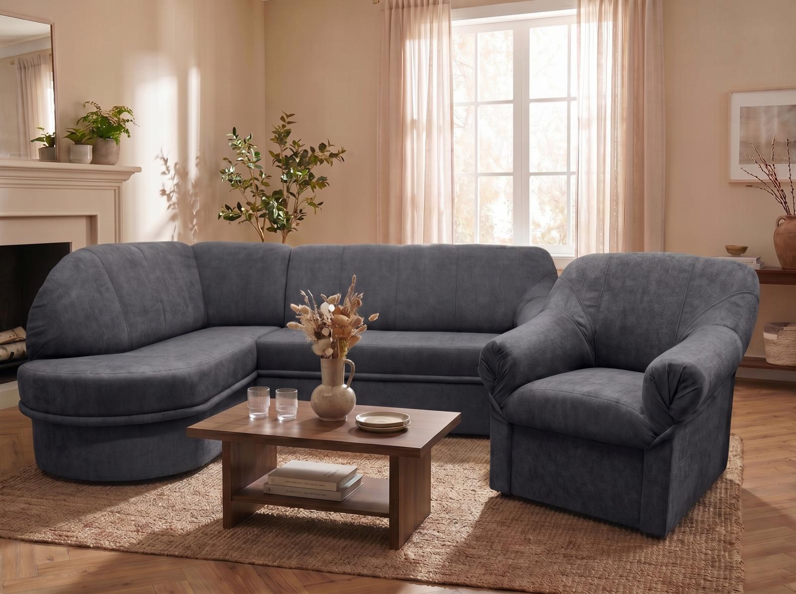 Velmi praktický set rohové sedací soupravy a křesla Sandra je vhodný do menších prostor. Pohodlné sezení zaručují pružiny bonel s PUR pěnou. Jednoduchým rozkladem sedací soupravy vznikne lůžko 190x125 cm vhodné k příležitostnému spaní. Sedací souprava má praktický úložný prostor na lůžkoviny. Celkový rozměr sedací soupravy je 240x185 cm.