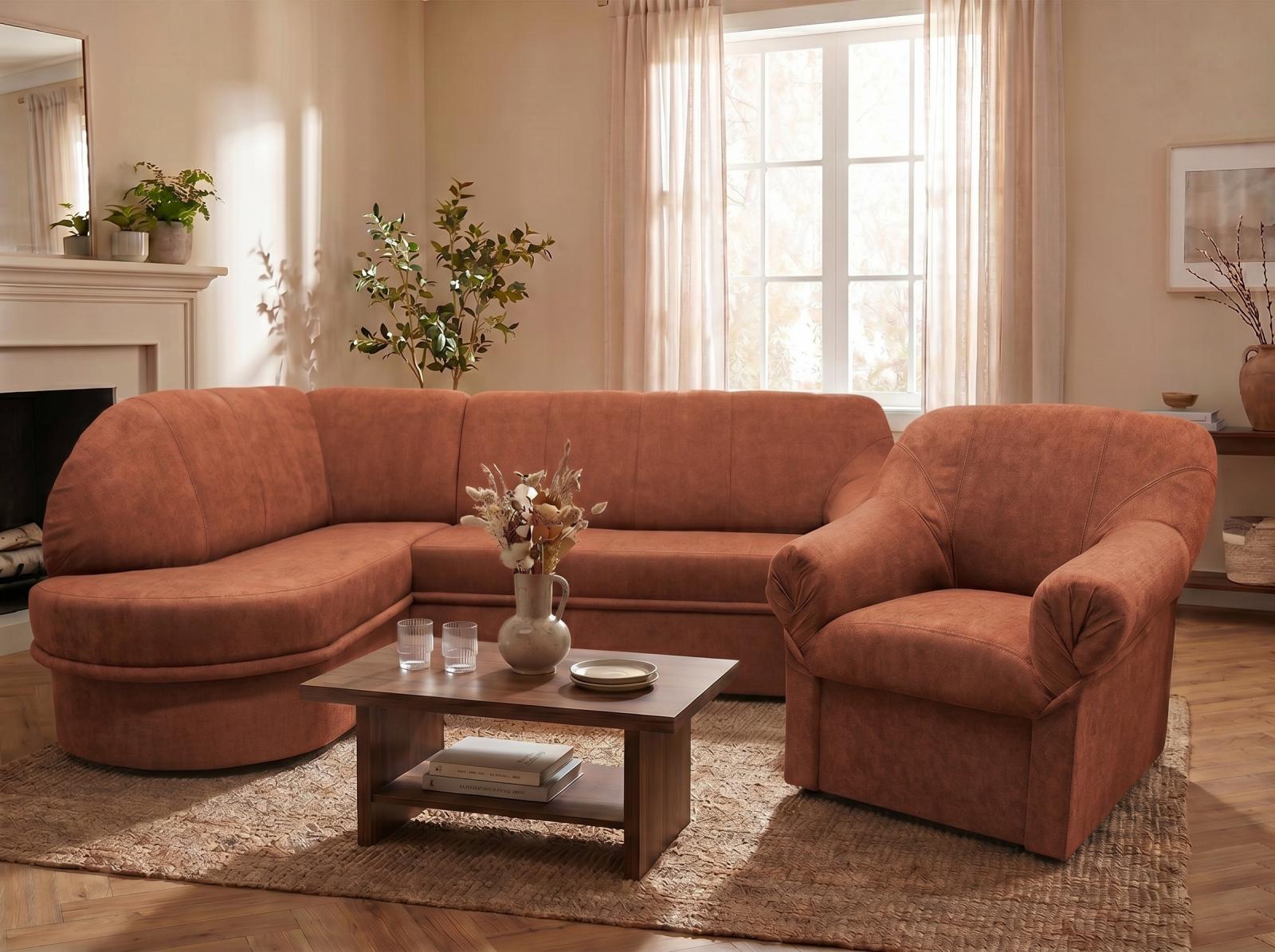 Velmi praktický set rohové sedací soupravy a křesla Sandra je vhodný do menších prostor. Pohodlné sezení zaručují pružiny bonel s PUR pěnou. Jednoduchým rozkladem sedací soupravy vznikne lůžko 190x125 cm vhodné k příležitostnému spaní. Sedací souprava má praktický úložný prostor na lůžkoviny. Celkový rozměr sedací soupravy je 240x185 cm.