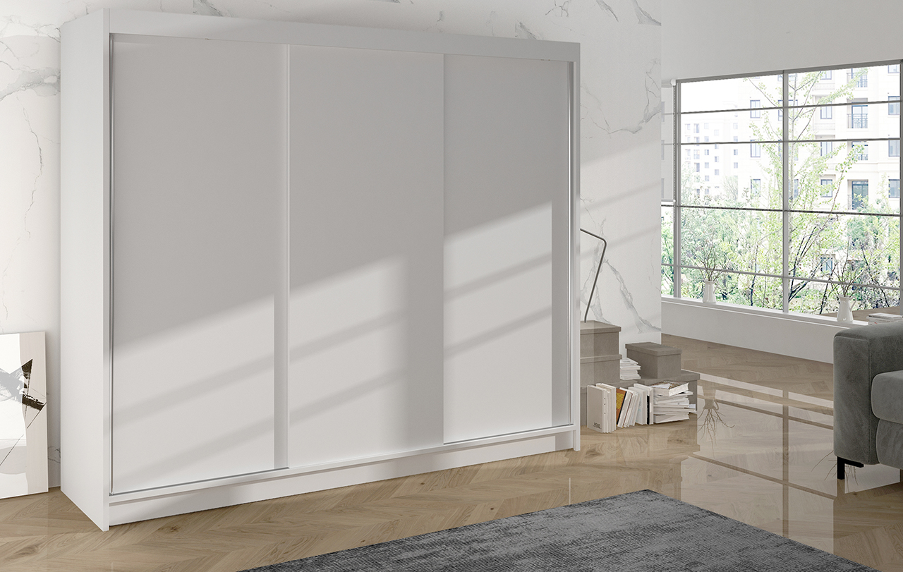Korpus i dveře jsou vyrobeny z odolné 16 mm laminované desky s ABS hranami, které zajišťují dlouhou životnost. Posuvné dveře se hladce pohybují po hliníkových vodicích lištách. Skříň je dostupná v několika atraktivních barevných provedeních, takže ji snadno sladíte s ostatním nábytkem.