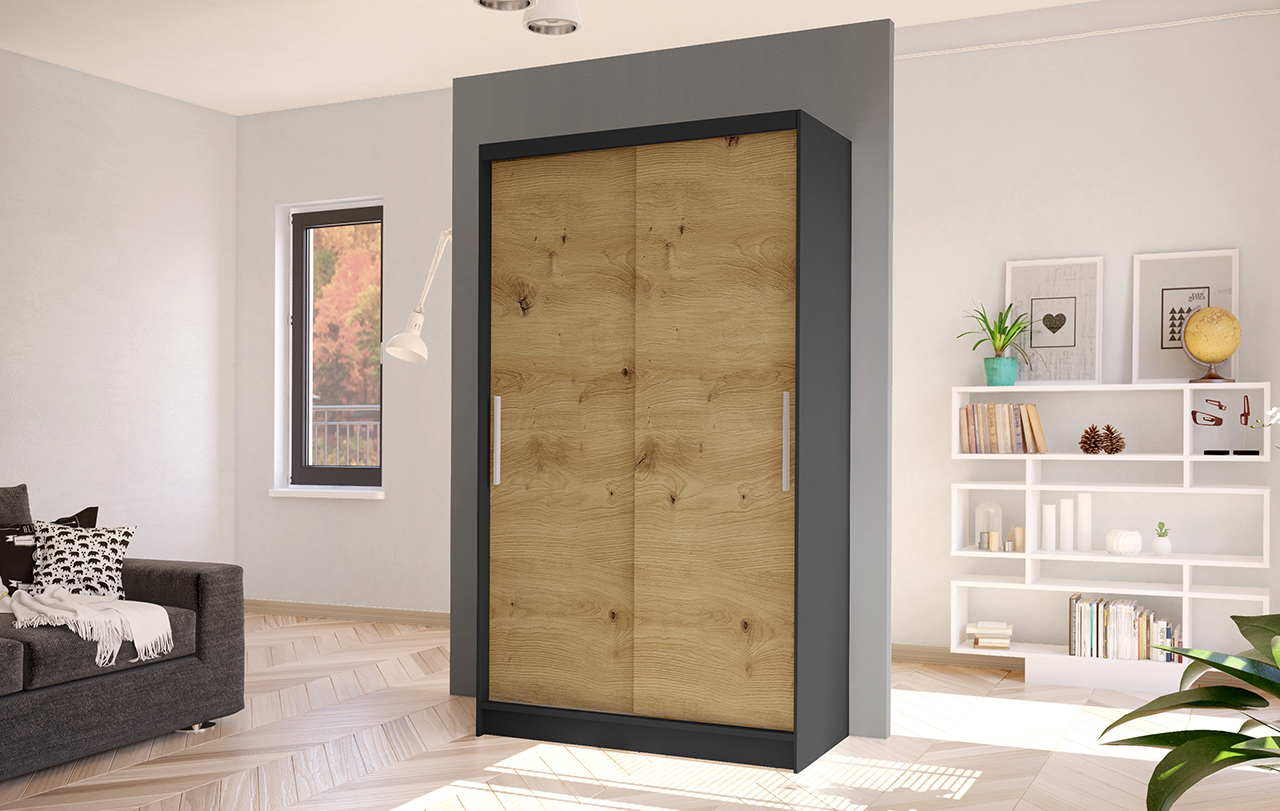 šířka 100 cm, barva černá/dub artisan, posuvné dveře, 4 police, šatní tyč