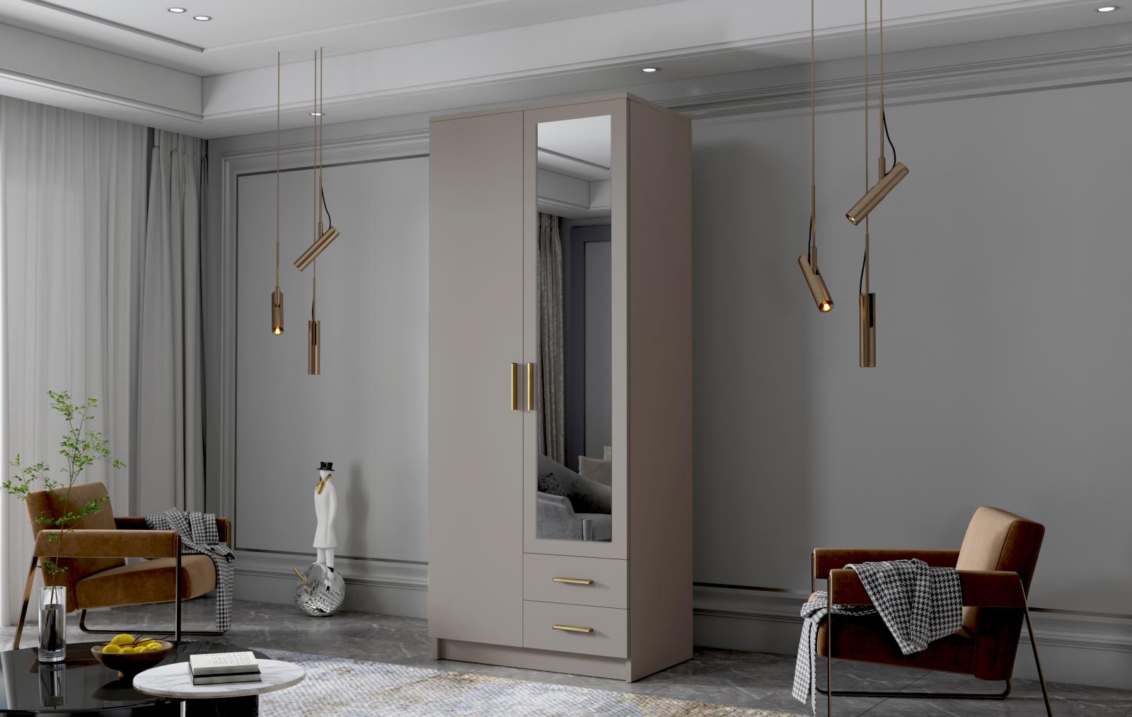šířka 80 cm, barva kašmír/zlaté úchytky, 2 šuplíky, 4 police, šatní tyč, zrcadlo