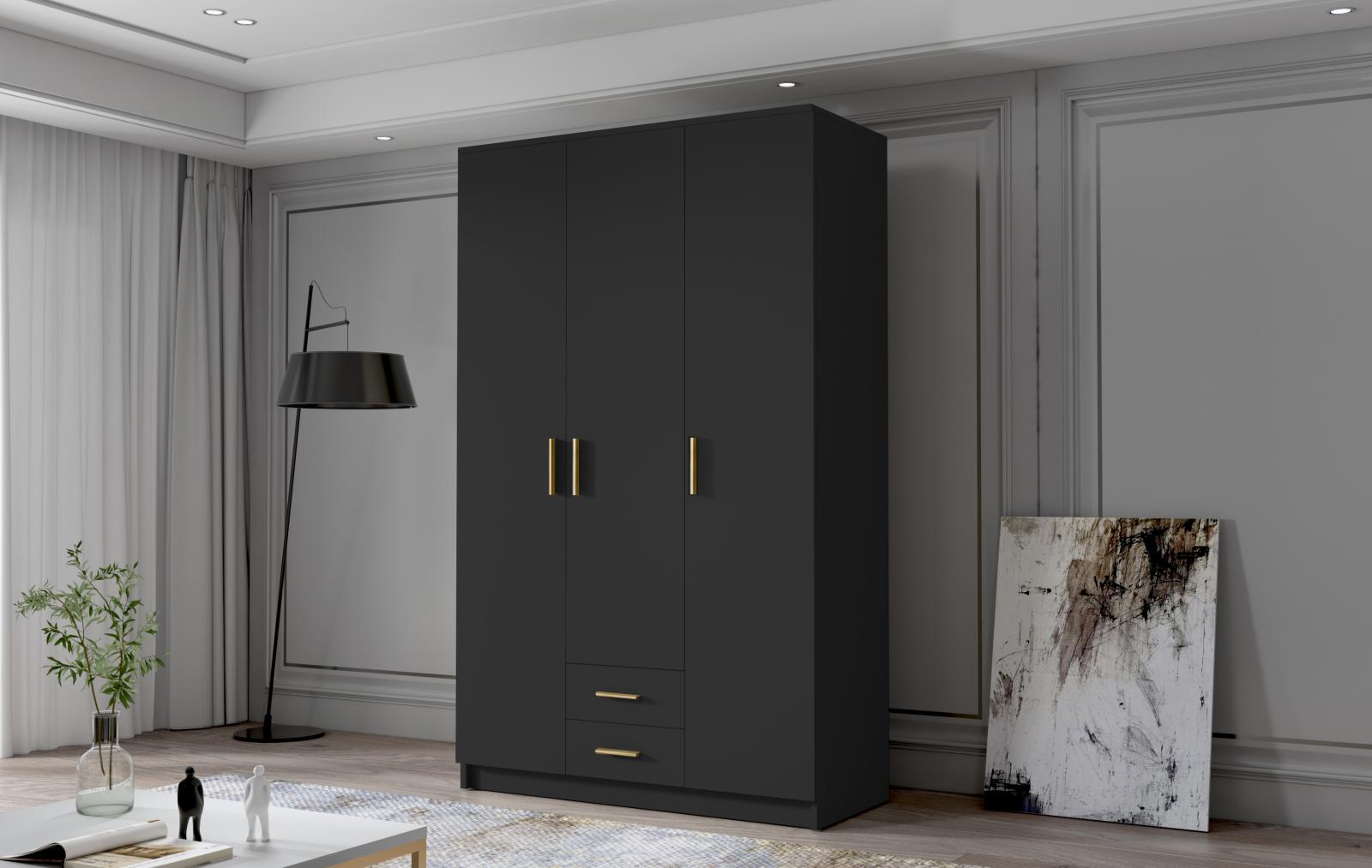 šířka 120 cm, barva černá/zlaté úchytky, 2 šuplíky, 5 police, šatní tyč