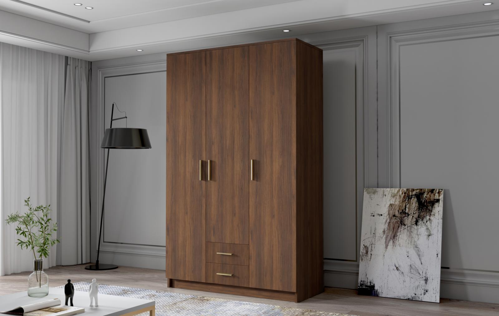šířka 120 cm, barva ořech/zlaté úchytky, 2 šuplíky, 5 police, šatní tyč