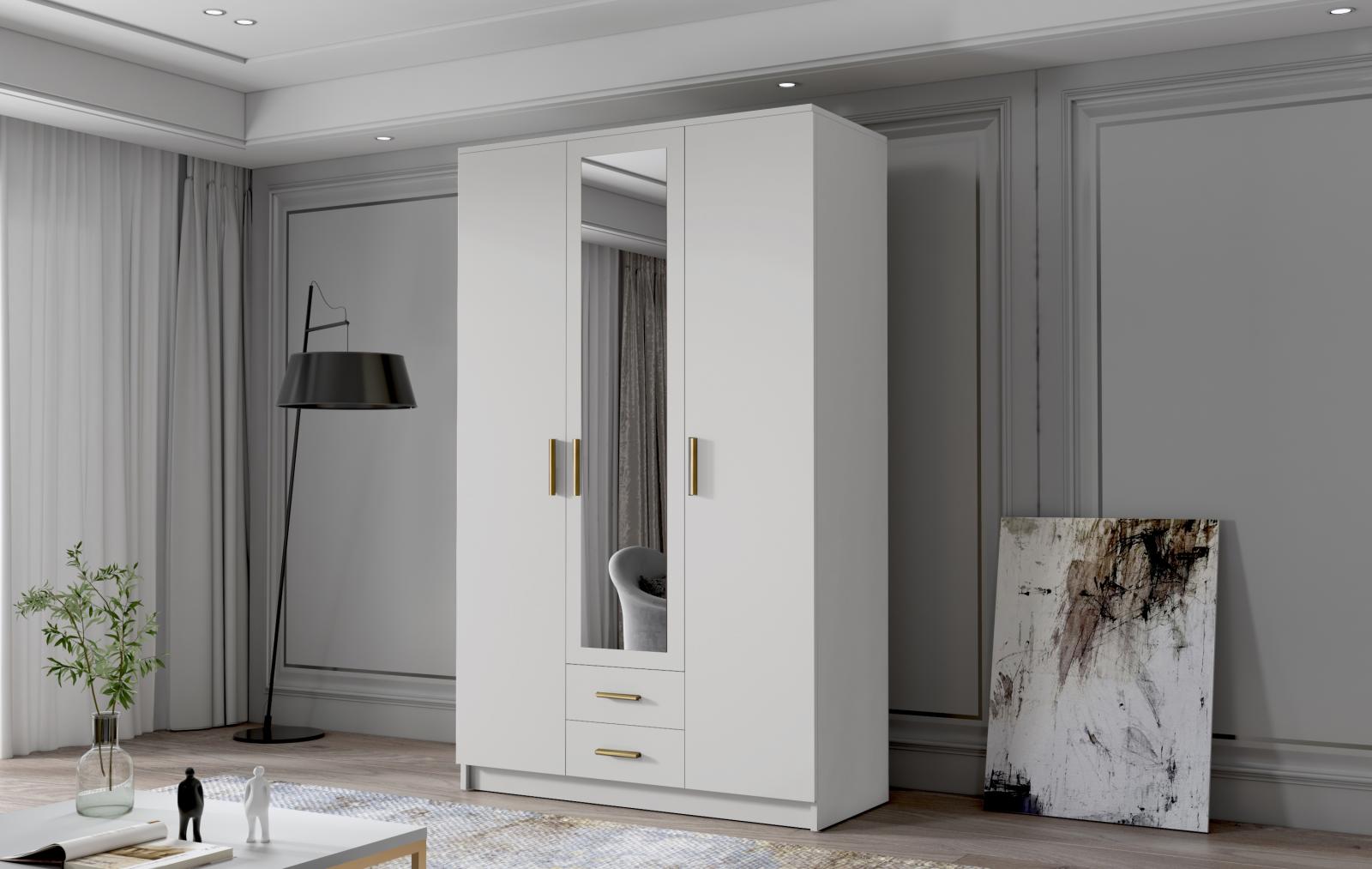 šířka 120 cm, barva bílá/zlaté úchytky, 2 šuplíky, 5 police, šatní tyč, zrcadlo