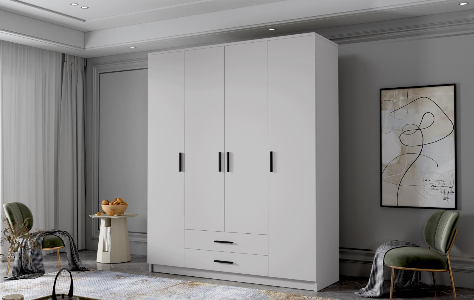 šířka 160 cm, barva bílá/černé úchytky, 2 šuplíky, 9 polic, šatní tyč