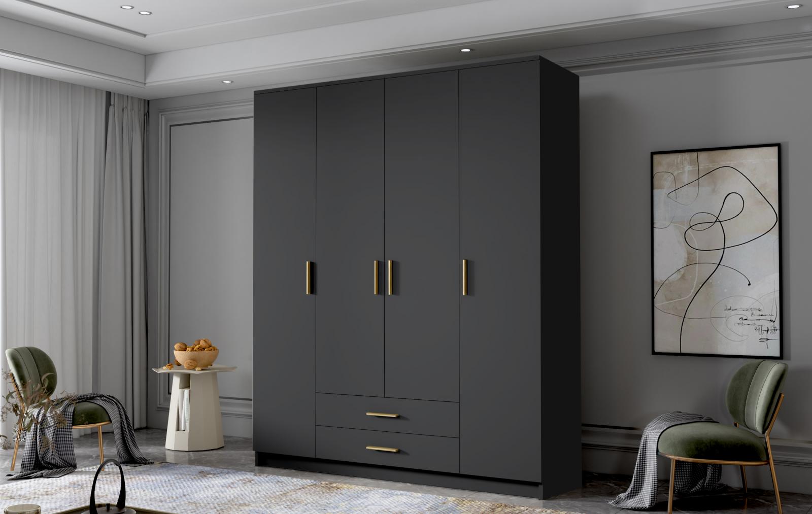 šířka 160 cm, barva černá/zlaté úchytky, 2 šuplíky, 9 polic, šatní tyč