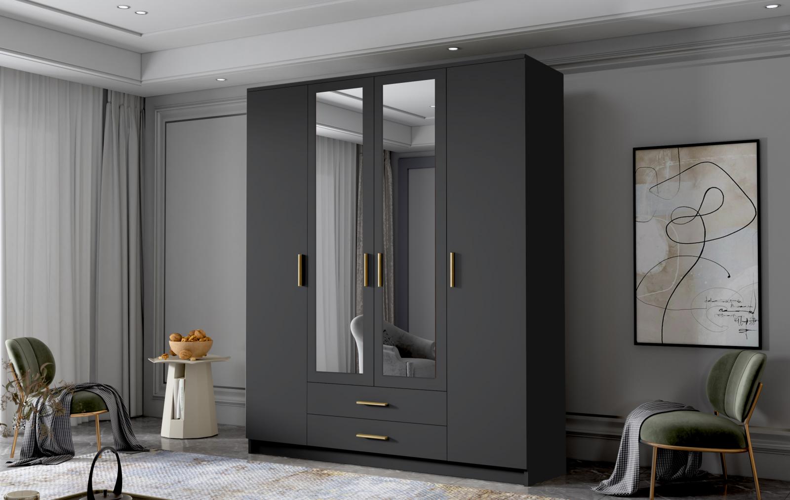 šířka 160 cm, barva černá/zlaté úchytky, 2 šuplíky, 9 polic, šatní tyč, zrcadlo