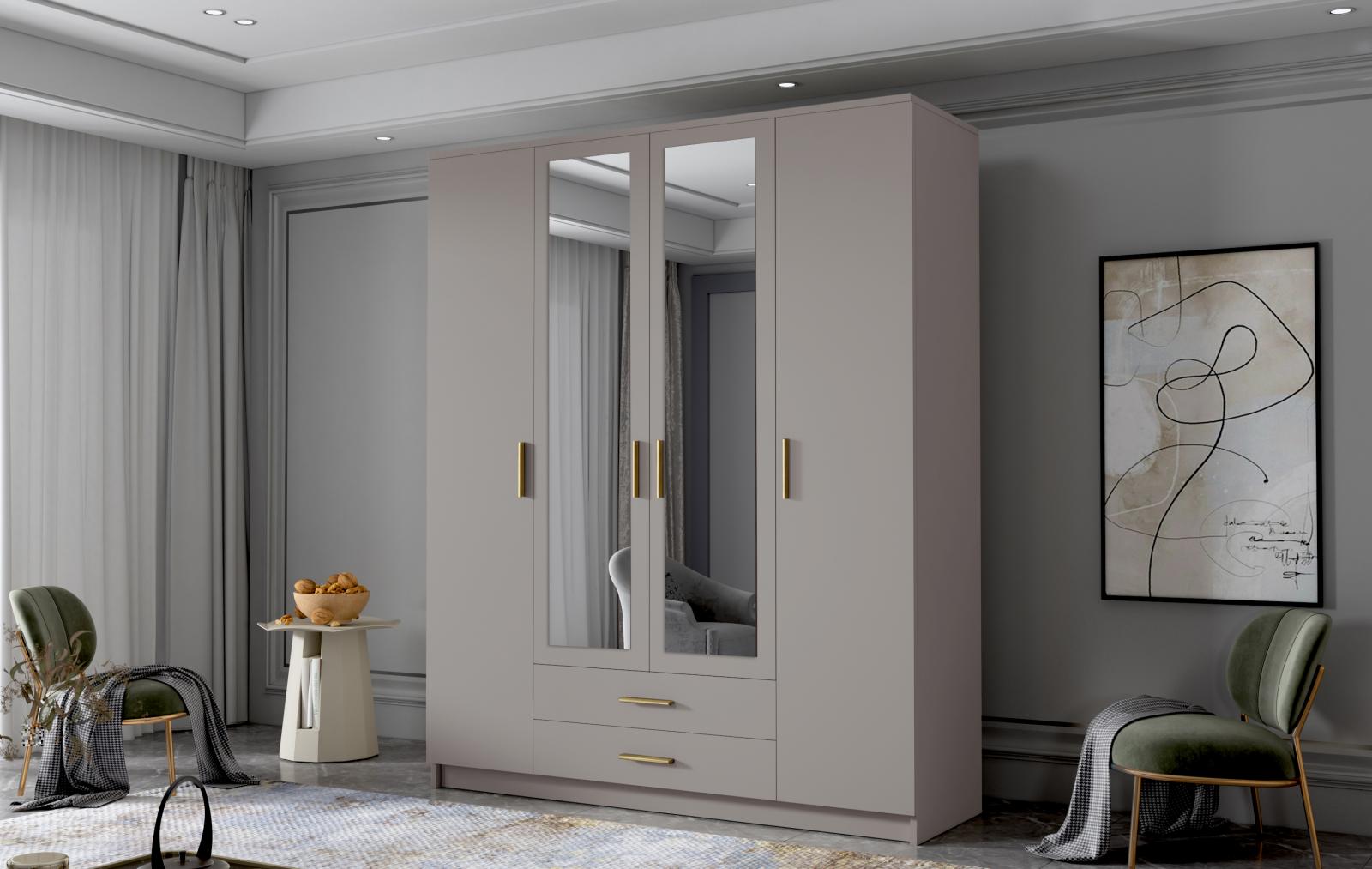 šířka 160 cm, barva kašmír/zlaté úchytky, 2 šuplíky, 9 polic, šatní tyč, zrcadlo