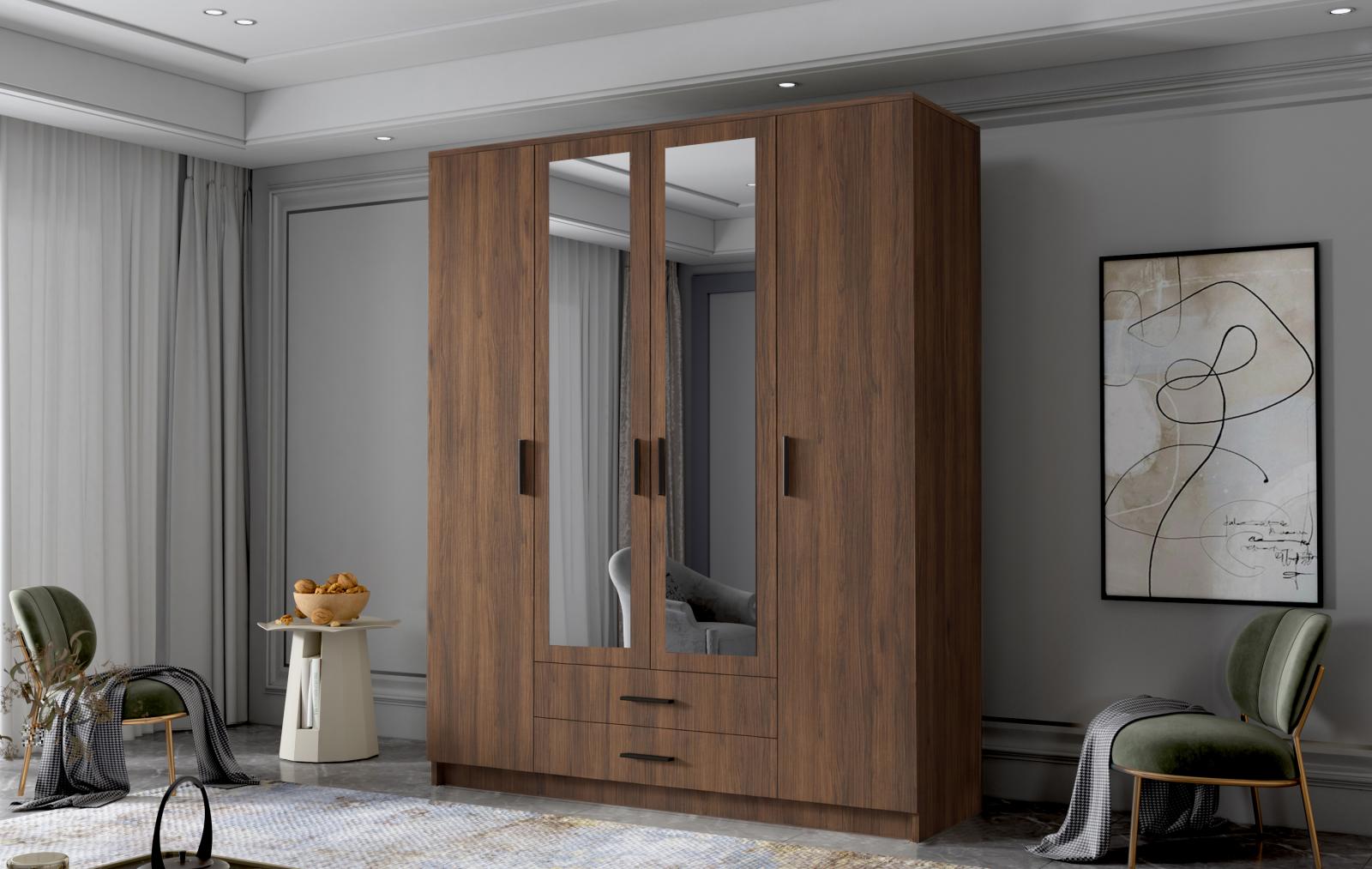šířka 160 cm, barva ořech/černé úchytky, 2 šuplíky, 9 polic, šatní tyč, zrcadlo