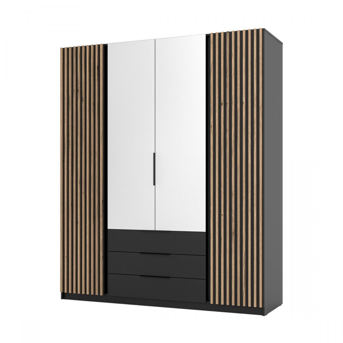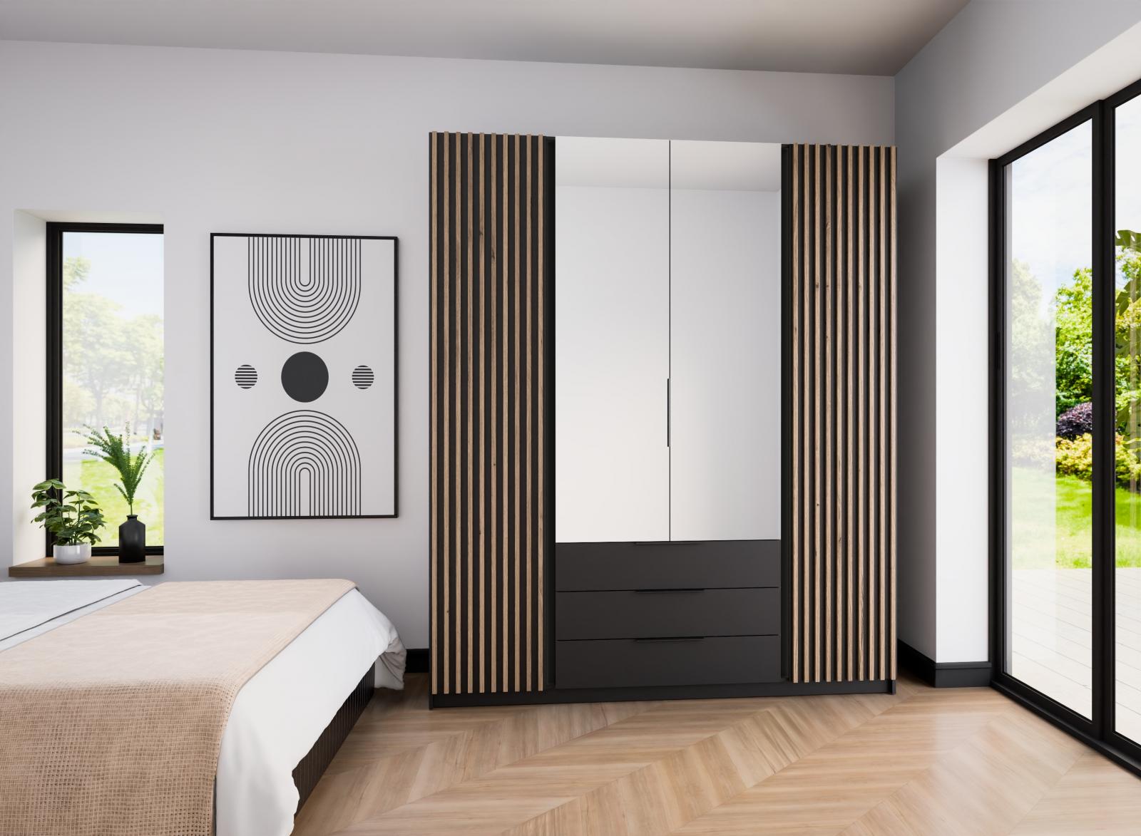 šířka 200 cm, barva černá/dub evoke, 3 šuplíky, 11 polic, šatní tyč, zrcadlo, lamely