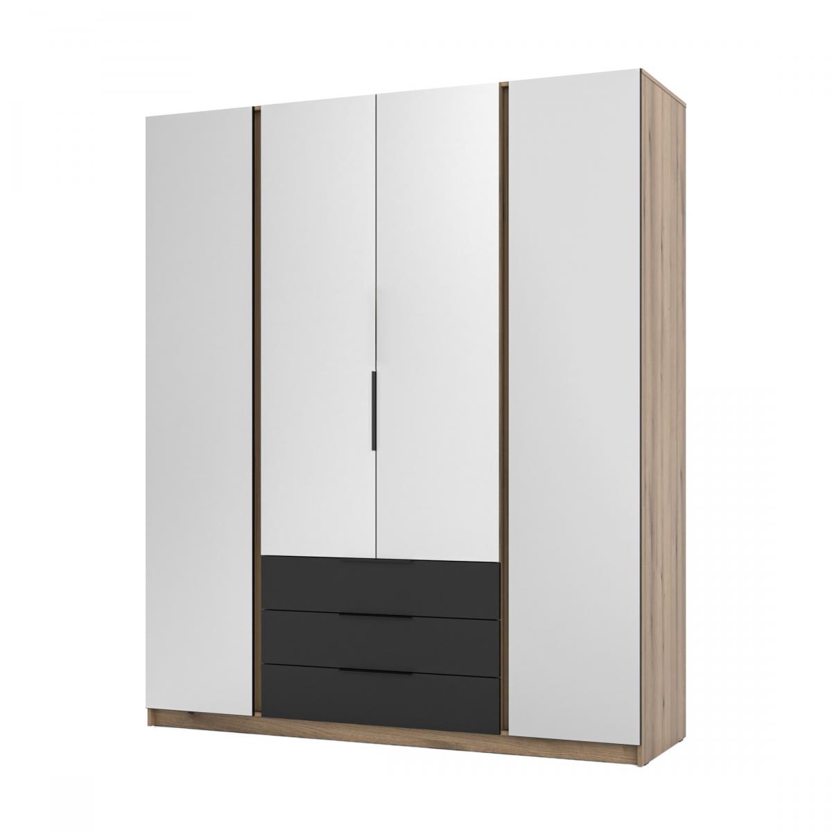 Šatní skříň Keny VI v moderním designu má šířku 200 cm a je rozdělena na tři praktické části. Vnitřní uspořádání kombinuje závěsnou tyč, 11 polic a 3 šuplíky, což umožňuje přehledné a praktické rozdělení šatníku.