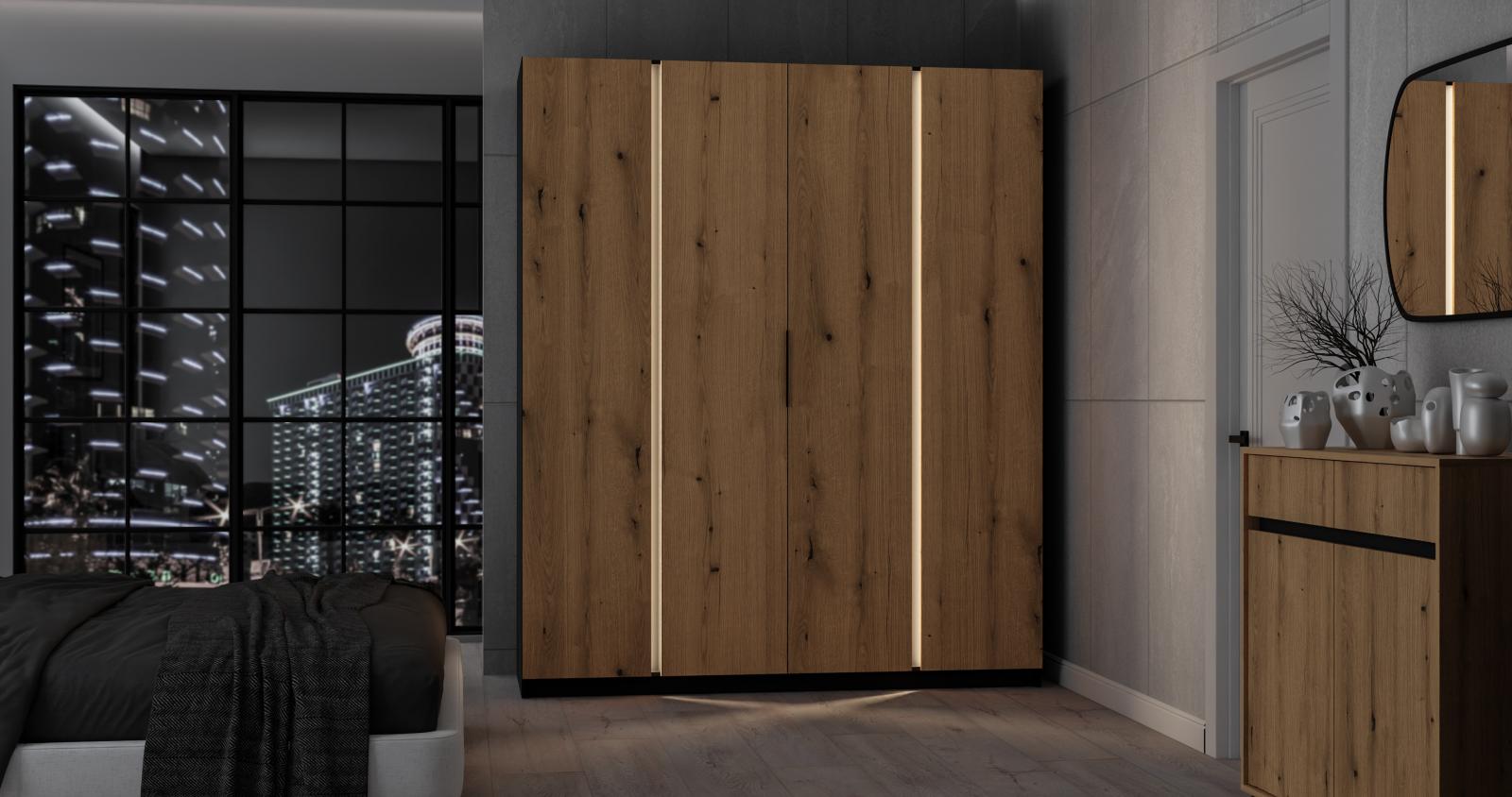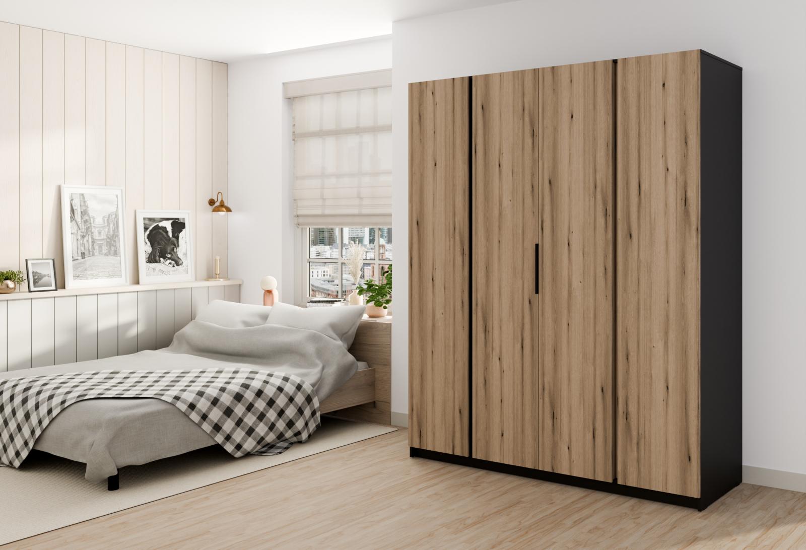 šířka 200 cm, barva černá/dub evoke, 11 polic, šatní tyč