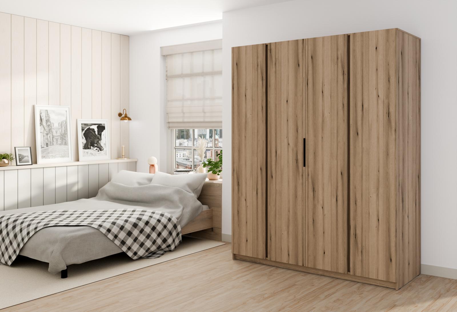 šířka 200 cm, barva dub evoke, 11 polic, šatní tyč