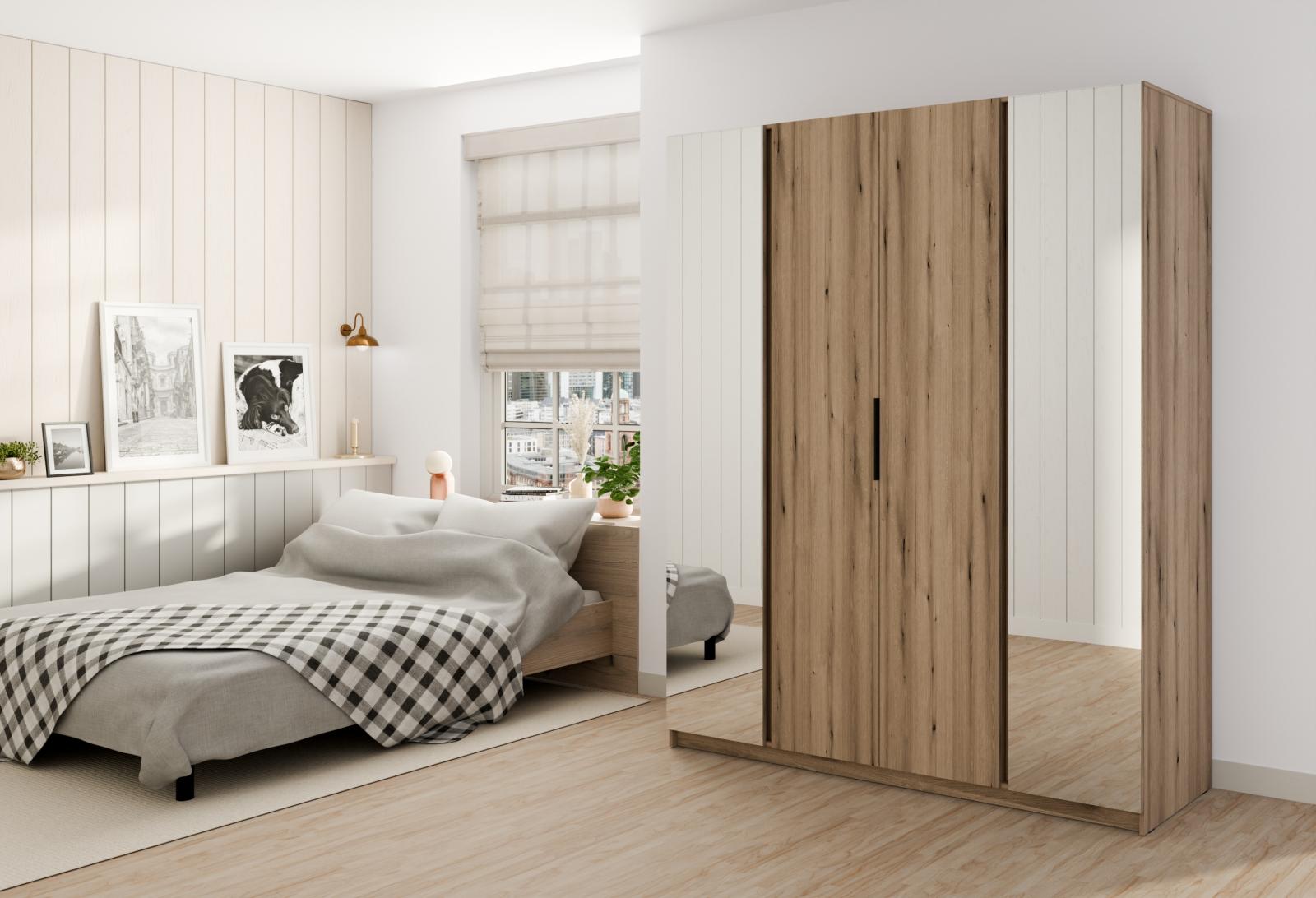 Šatní skříň Keny VIII v moderním designu má šířku 200 cm a je rozdělena na tři praktické části. Vnitřní uspořádání kombinuje závěsnou tyč a 11 polic, což umožňuje přehledné a praktické rozdělení šatníku.