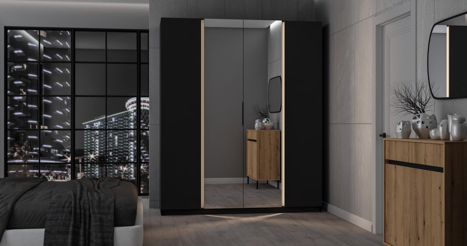 šířka 200 cm, barva černá, 11 polic, šatní tyč, zrcadlo
