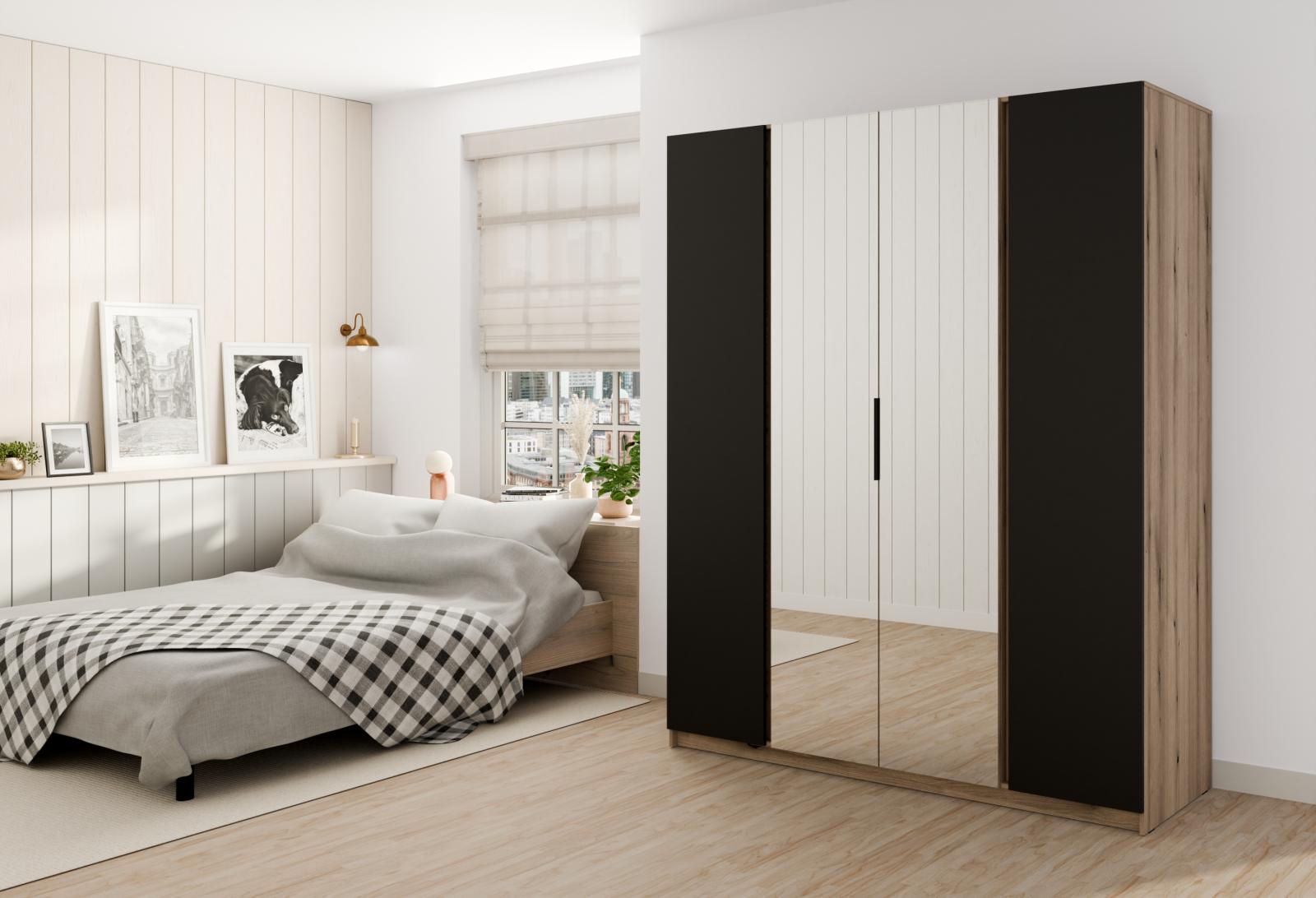 šířka 200 cm, barva dub evoke/černá, 11 polic, šatní tyč, zrcadlo