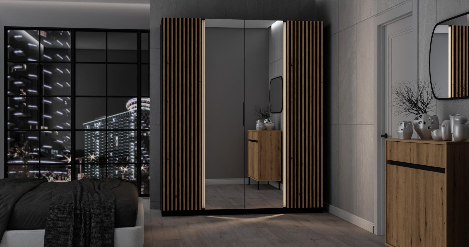 šířka 200 cm, barva černá, 11 polic, šatní tyč, lamely, zrcadlo