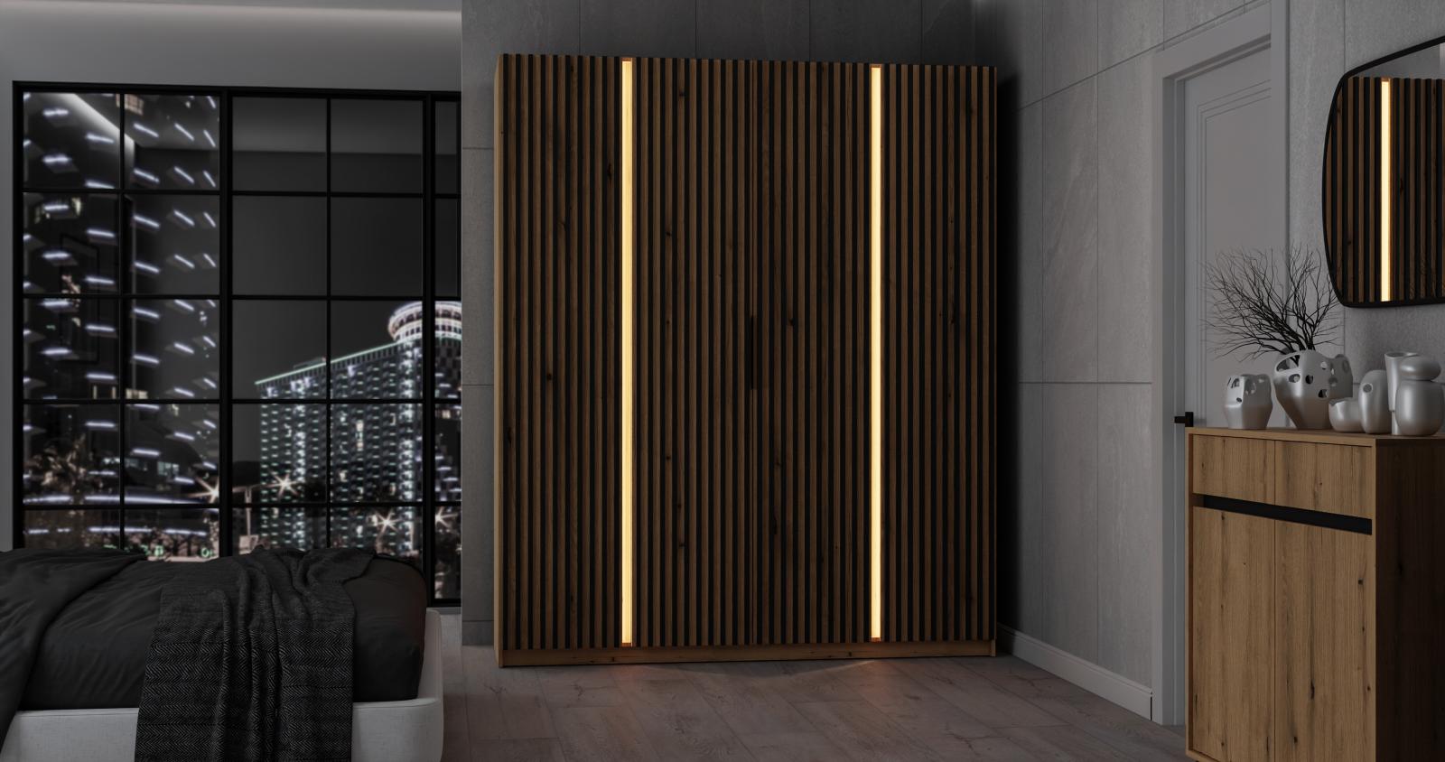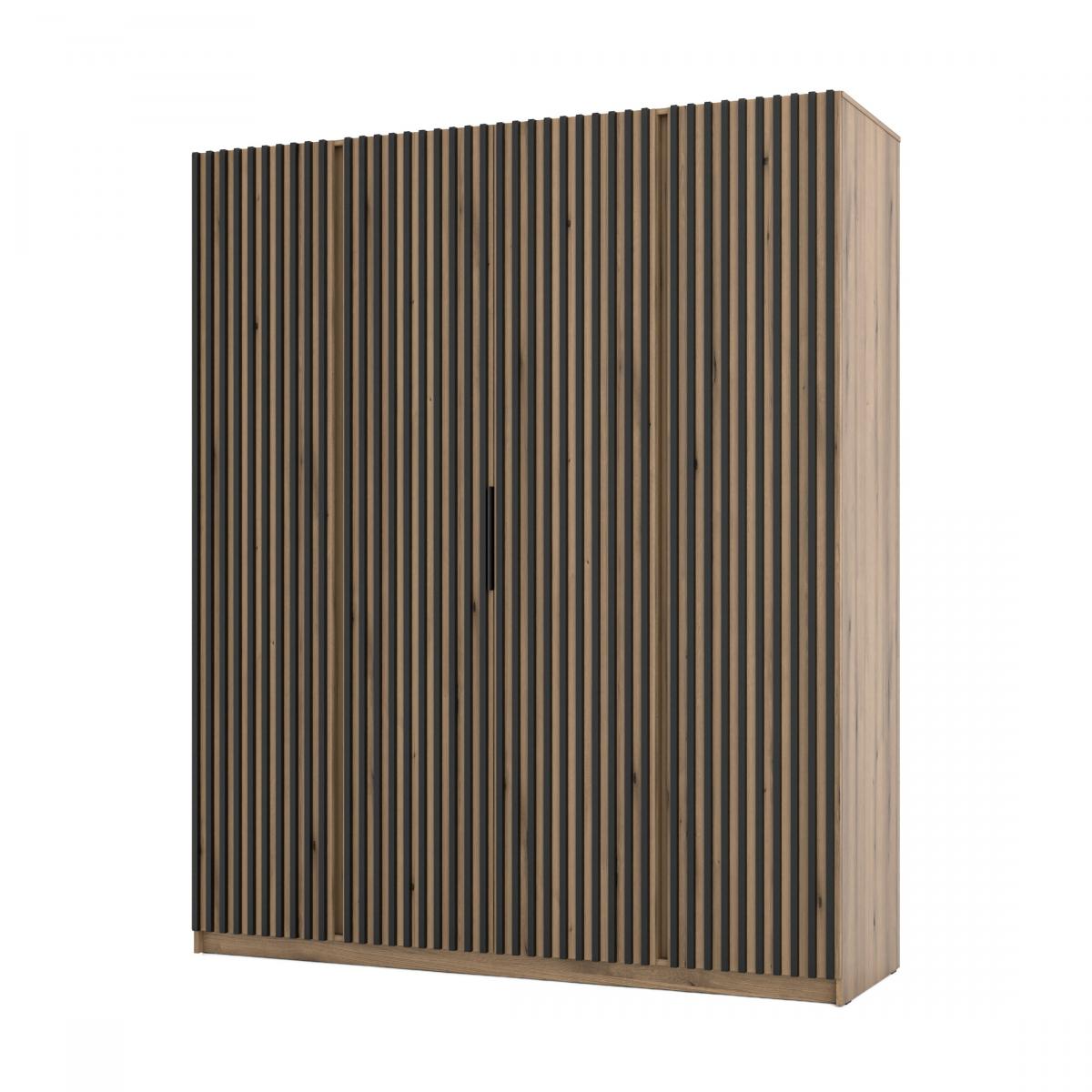 šířka 200 cm, barva dub evoke, 11 polic, šatní tyč, lamely