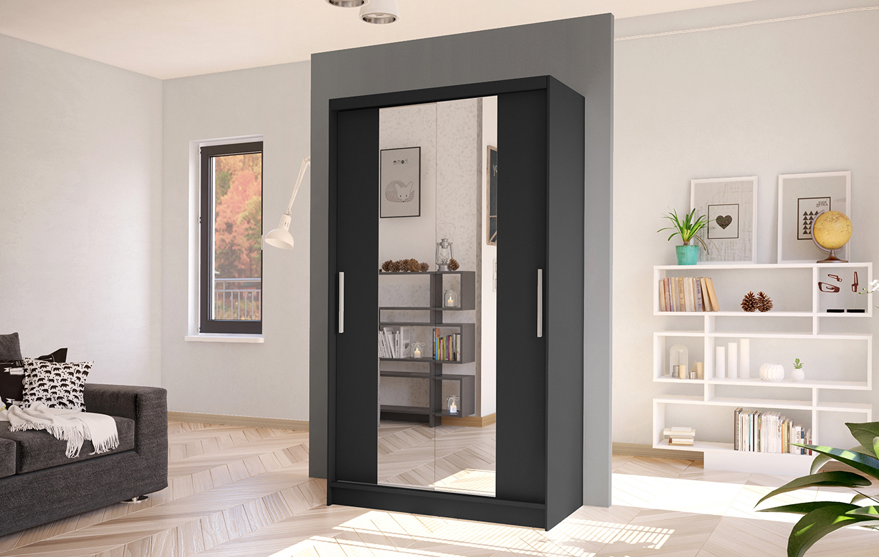 šířka 100 cm, barva černá, posuvné dveře, 4 police, šatní tyč
