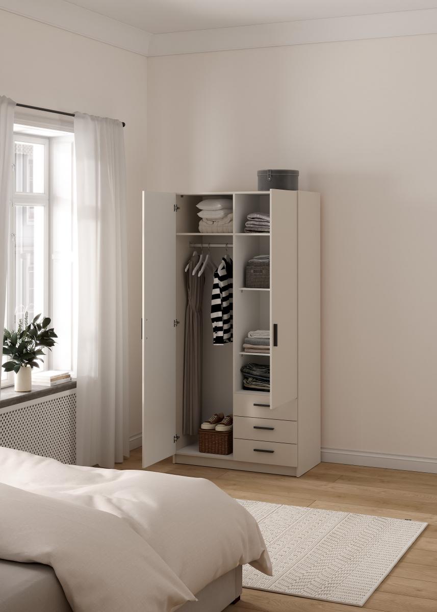 šířka 99 cm, 2 dvěře + 3 zásuvky, šatní tyč, nastavitelné police, více variant