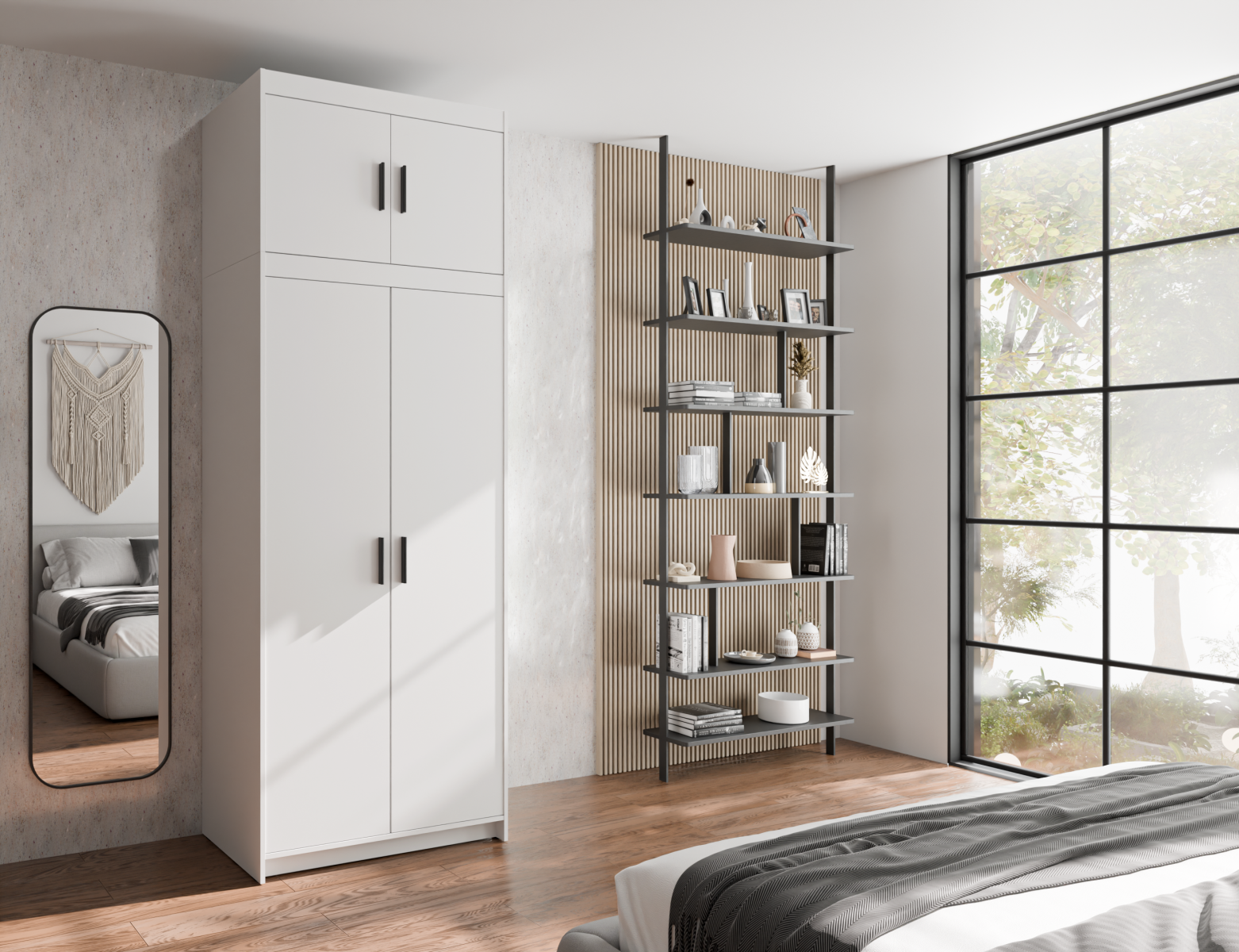 šířka 90 cm, 2 dveře, 5 polic, šatní tyč