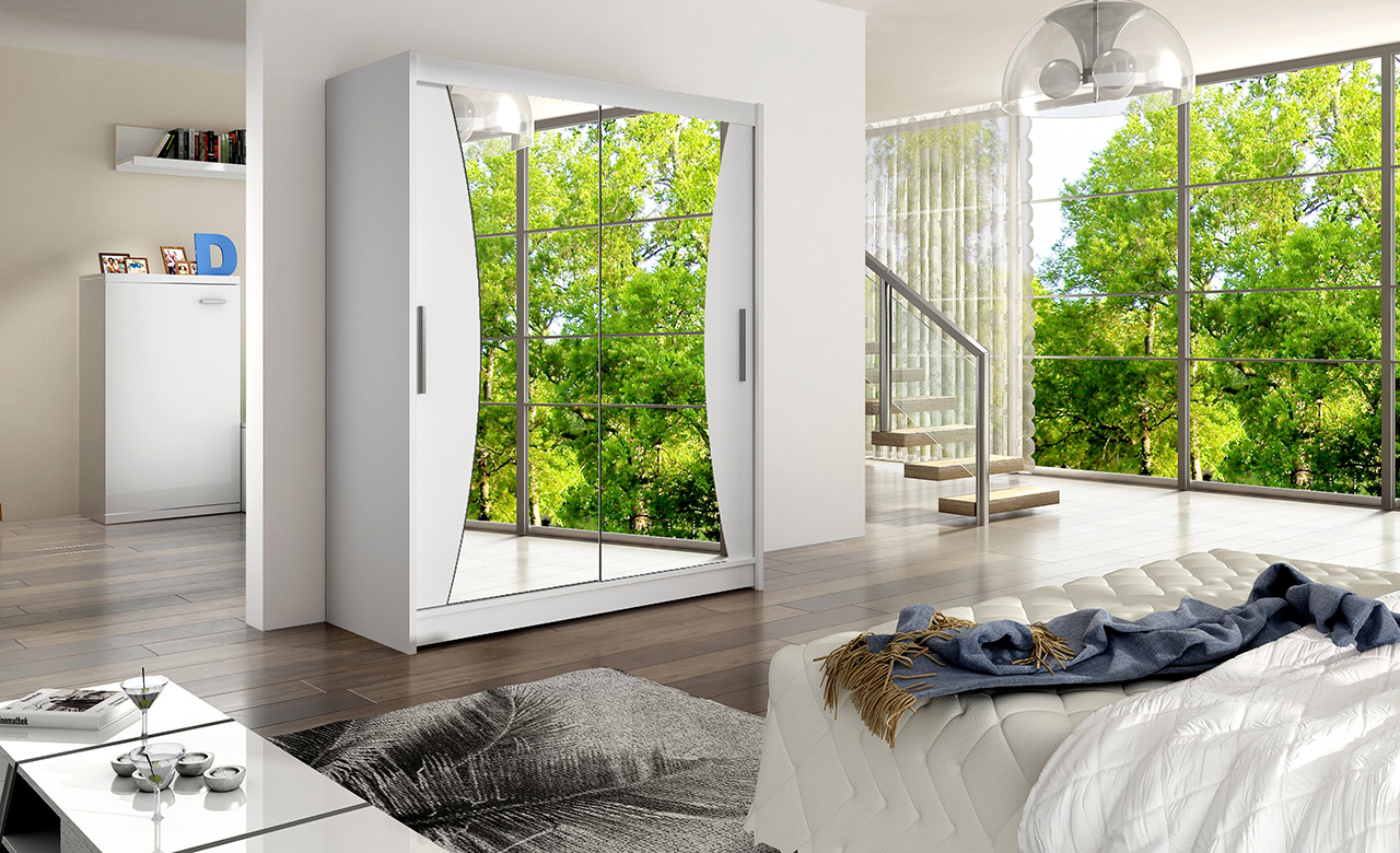 Jednoduchý a elegantní design skříně osloví i náročné zákazníky. Eleganci podtrhují dlouhé stříbrné úchyty a součástí jsou i skleněná zrcadla, která jsou nalepena na dveřích skříně a po stranách zaříznutá do oblouku. Je vyrobena z lamina o síle 16 mm a hrany jsou ukončeny ABS lištou. Vodící lišty jsou vyrobeny z odolného hliníku a splňují požadavky pro každodenní užívání. Díky svému uspořádání poskytuje dostatek úložného prostoru a zrcadlo prostor opticky zvětší a prosvětlí. Skvěle se hodí do ložnice, předsíně, dětského, nebo studentského pokoje. Skříň je dodávána v demontu a součástí je montážní plánek včetně všech potřebných spojovacích materiálů. Vyobrazené dekorace nejsou v ceně.