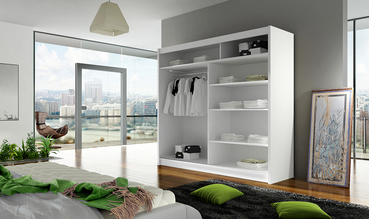 Skříň Berger s posuvnými dveřmi, je vyrobena z kvalitního lamina o síle 16 mm a hrany jsou ukončeny ABS lištou. Vodící lišty jsou vyrobeny z odolného hliníku a splňují požadavky pro každodenní užívání. Skříň je doplněna zrcadlem, které jí dodává elegantní vzhled a místnost opticky zvětší a prosvětlí. Nabízíme ji ve čtyřech odstínech. Díky svým rozměrům a uspořádání poskytuje dostatek úložného prostoru. Skříň je dodávána v demontu a součástí je montážní plánek včetně všech potřebných spojovacích materiálů. Vyobrazené dekorace nejsou v ceně. Skleněné zrcadlo je součástí skříně.