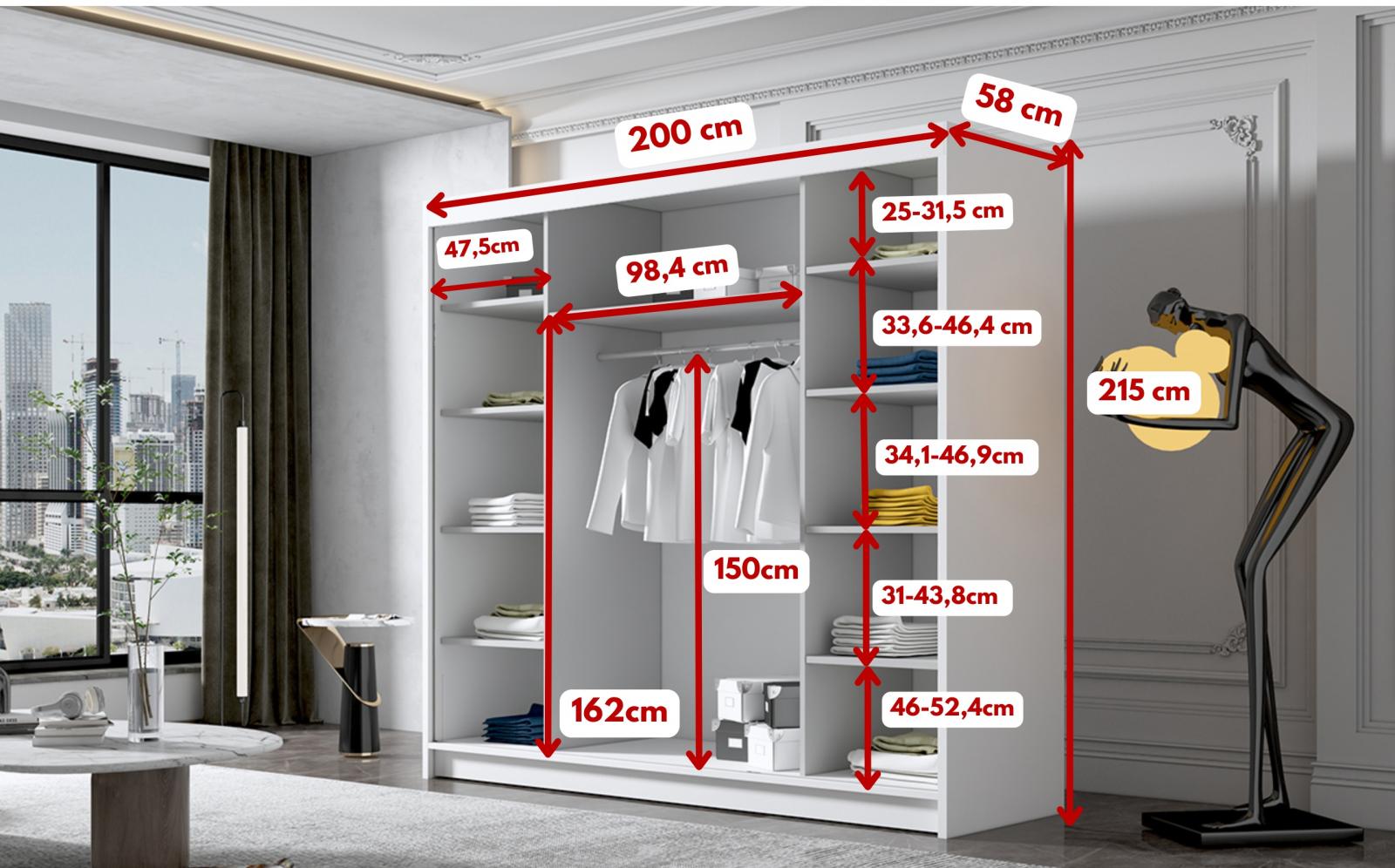 Šatní skříň Debora I v moderním designu má šířku 200 cm a je rozdělena na tři praktické části. Posuvné dveře šetří místo a usnadňují přístup do interiéru. Vnitřní uspořádání kombinuje závěsnou tyč a devět polic, což umožňuje přehledné a praktické rozdělení šatníku.