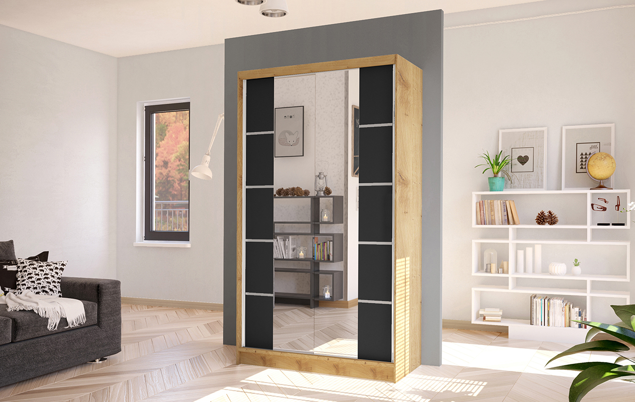 šířka 100 cm, barva dub artisan/černá, posuvné dveře, 4 police, šatní tyč